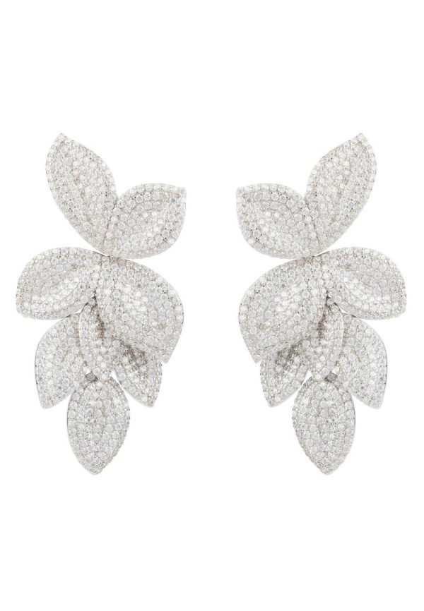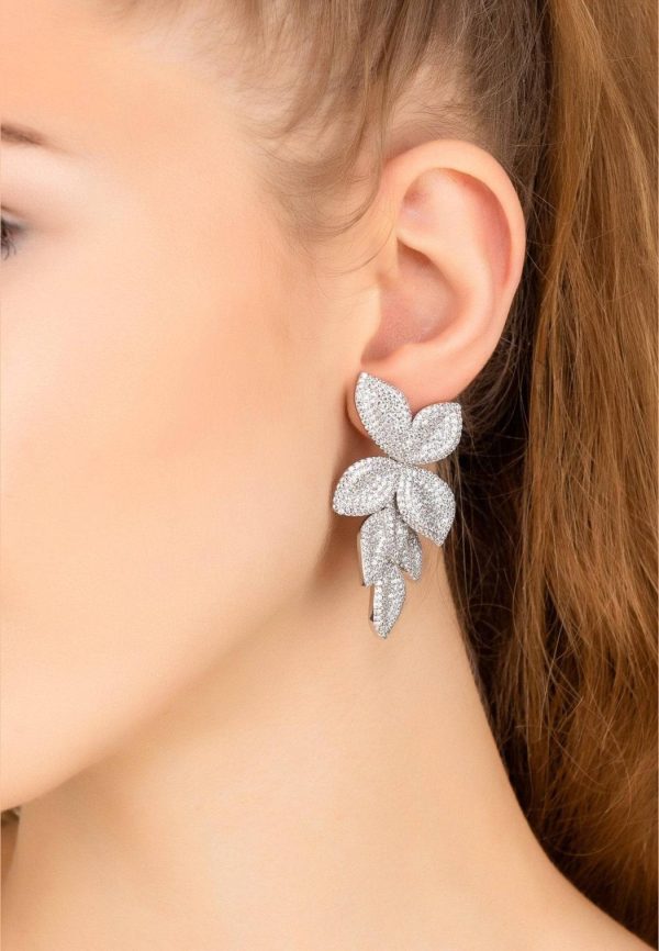 To allow for natural movement when worn, there is a link beneath the first two petals which form the stud top. They are 5.5cm in length and 3cm wide and made from 925 sterling silver that has been handset with micro pave white cubic zirconia.