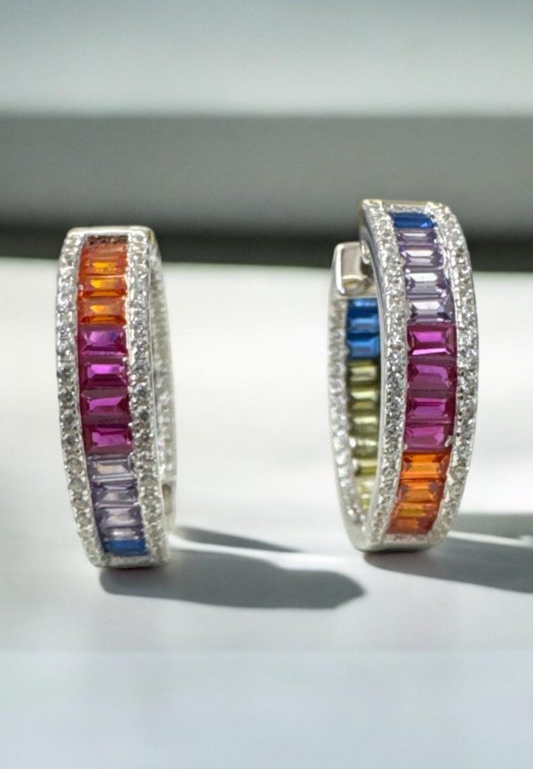 The real highlight of these earrings is the vibrant array of baguette-cut zircons that adorn them, shimmering with every movement. To enhance the sparkle even further, the outer edges are set with single rows of white cubic zirconia, adding a touch of classic brilliance to the colourful design.