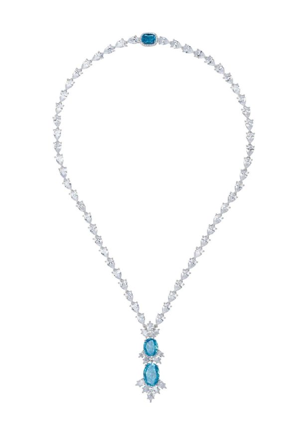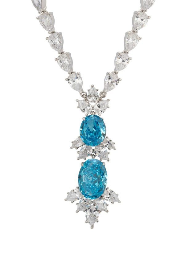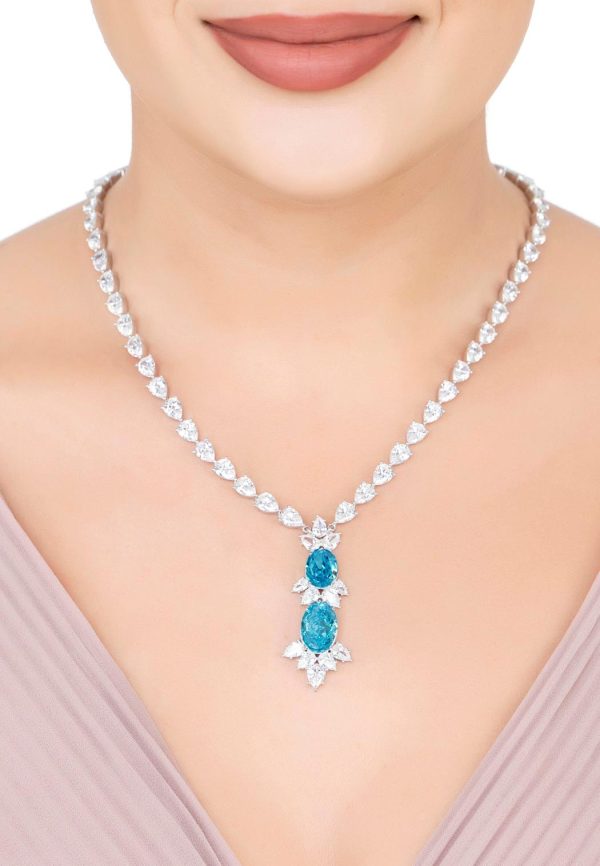 The attention to detail extends to the fastening of the necklace, where a rectangular-cut blue topaz is encircled by a delicate row of small round simulated diamonds. This thoughtful addition ensures that the necklace dazzles from every angle, making it perfect for those with short hair or those who prefer to wear their hair up.