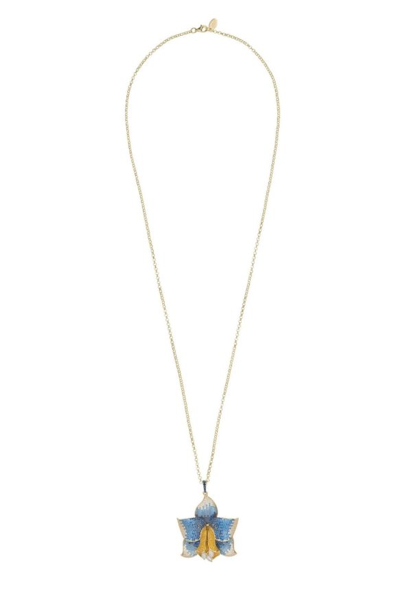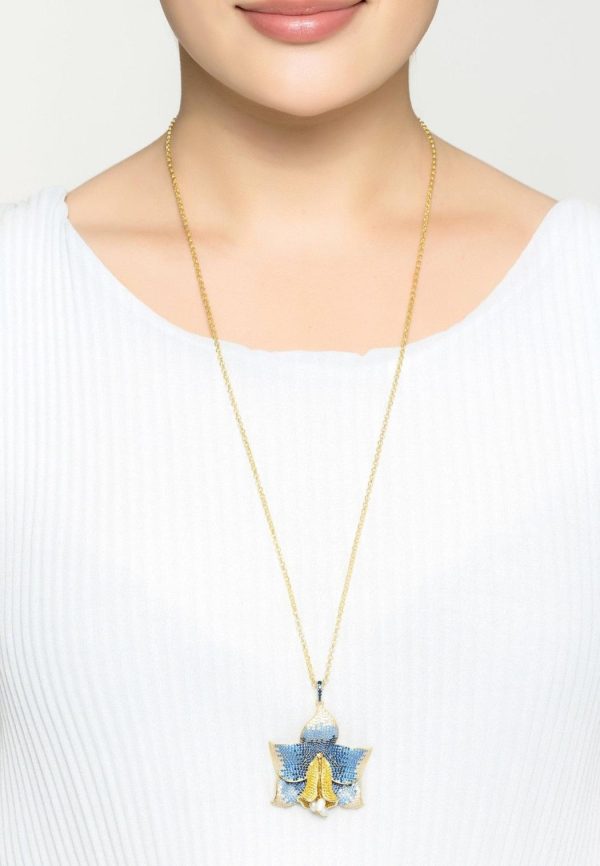 Greet every day in style with this gorgeous and statement-making piece of jewellery. Crafted entirely by hand and made from 925 sterling silver dipped in 22ct gold to create the perfect golden finish, this necklace is just breathtakingly beautiful. Adorned with sapphire blue, yellow, and white zirconia as well as three delicate pearls that mimic the stamen inside the flowers trumpet, you’ll look like a vision from nature adorned in this exquisite piece.