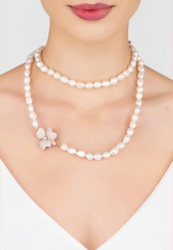 This long pearl gemstone necklace is ideal for those who adore statement jewellery. Make this stunning pearl necklace, adorned by a single zirconia encrusted flower, your new wardrobe staple.
