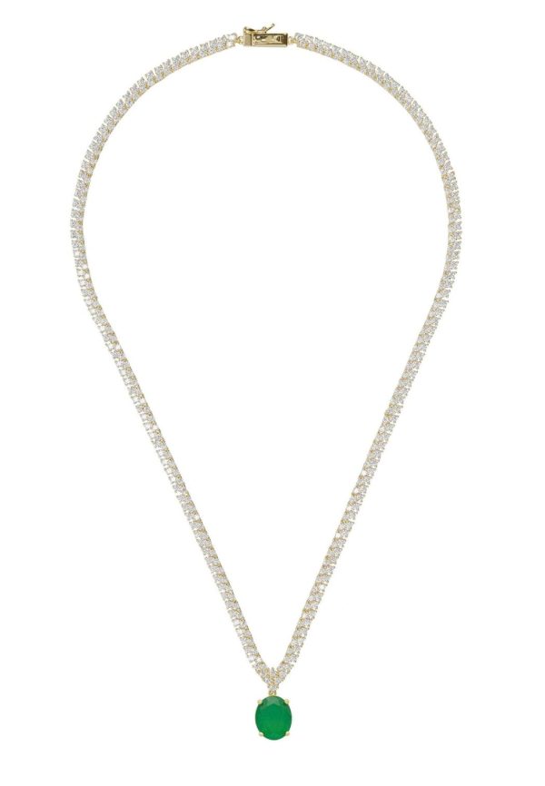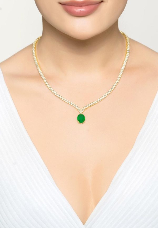 Ladies, get ready to add sparkle to your day with the beautiful Garbo Oval Gemstone tennis necklace. This show-stopping piece is sure to turn heads! Crafted from 925 sterling silver dipped in gleaming 22ct gold, the necklace has a length of 42 cm and weighs 29.5 grams and is adorned along its entire length with zirconia that shimmer like stars. At the base of the choker, an eye-catching oval lab-created Emerald gemstone adds a unique point of interest decorating your neckline with enviable sparkle and colour.