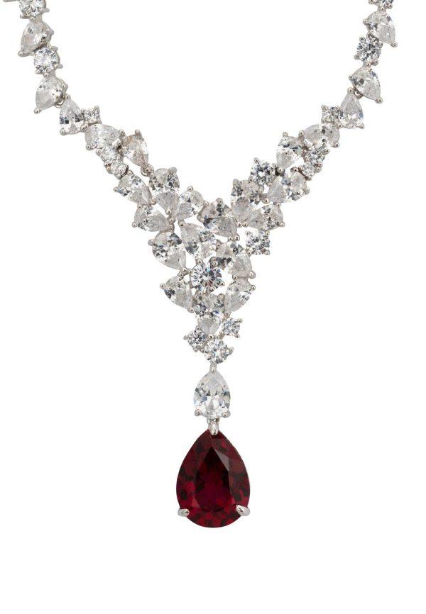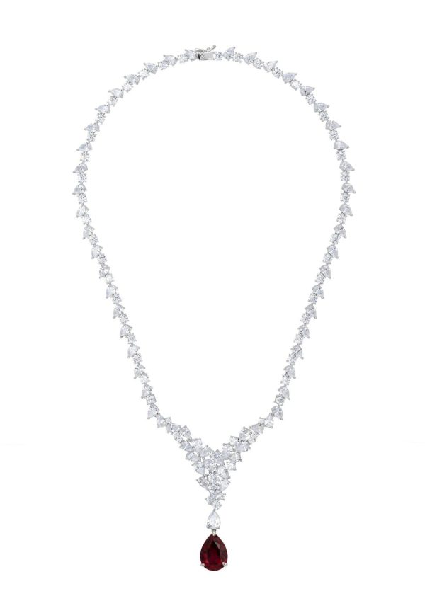 Introducing the Lydia Statement Necklace in Ruby Silver, a masterpiece of elegance and brilliance. Weighing 45.5 grams, this exquisite necklace made with 925 sterling silver is adorned with simulated diamonds from end to end, culminating in a striking triangular formation at the front. At the tip of this dazzling triangle hangs a teardrop-shaped lab-grown Ruby, the birthstone for July, adding a touch of passionate colour and deep significance.